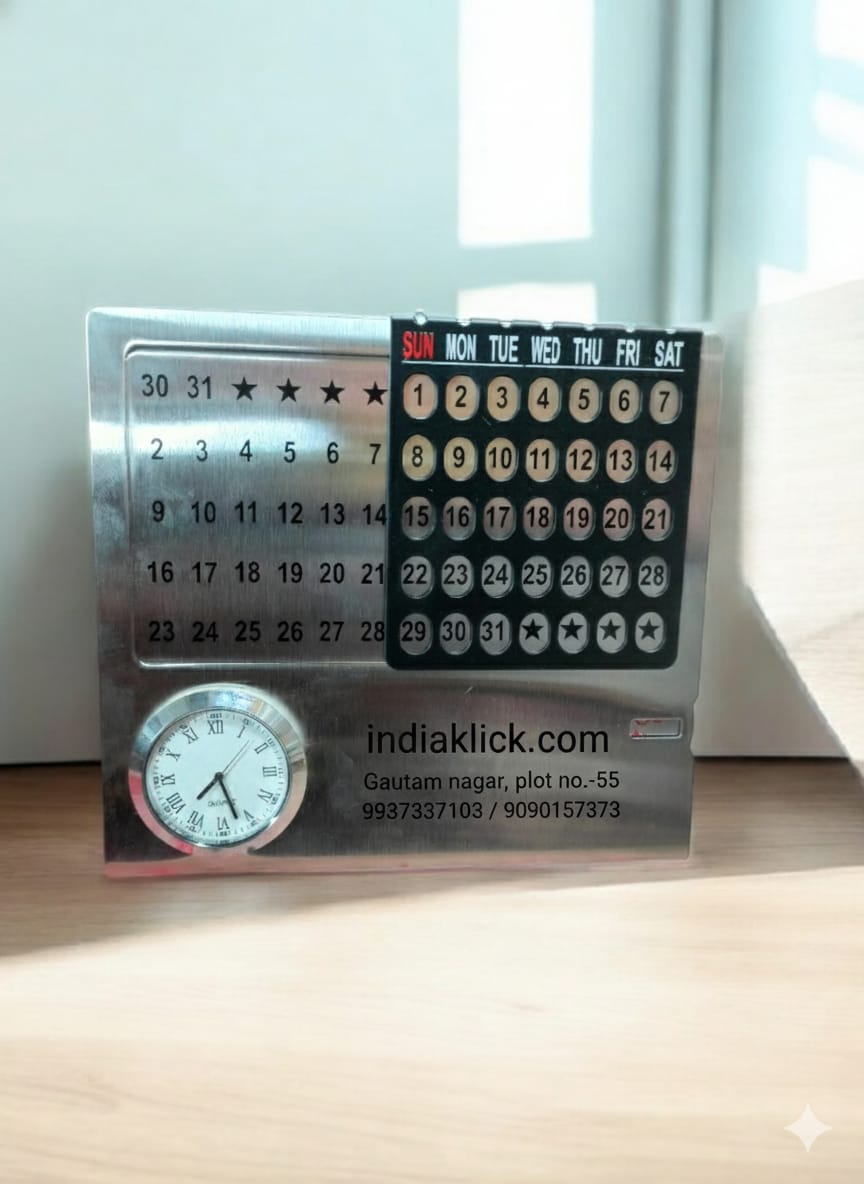 SILVER SS MONTH TABLE CALENDER WITH A WATCH ON IT.
