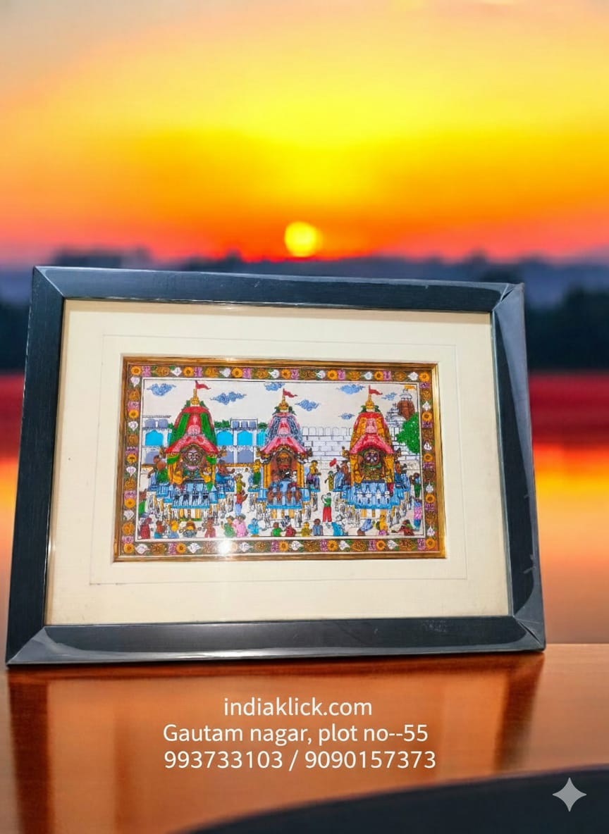roduct Description – Pattachitra of Sri Jagannath, Balabhadra, Subhadra & Sudarshana (32×24 cm)Authentic hand-painted Pattachitra made on Patta Silk, a specially treated smooth and durable clothDepicts Sri Jagannath, Lord Balabhadra, Devi Subhadra & Sudarshana Chakra in traditional Odisha art stylePremium framed artwork – ready to hang or displayCompact and elegant, suitable for home temples, wall décor, or keeping safely in the wardrobePerfect for gifting and corporate branding, thanks to its premium look and cultural valueComes with gift packing for an impressive presentationSize: 32 × 24 cm (approx.)Vibrant colours & intricate detailing showcasing Odisha’s heritage craftsmanship
